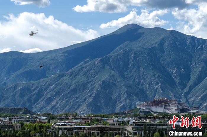 8月8日,空客H125直升机在拉萨进行吊桶洒水飞行演示。中新社记者 江飞波 摄